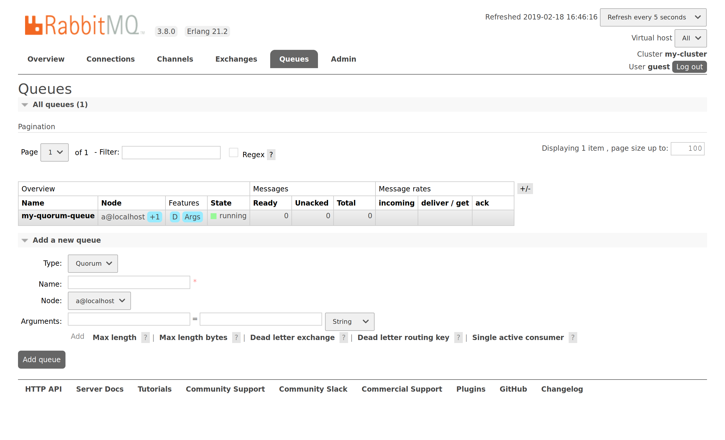 For instance, we could try to declare a quorum queue on node A, but it is denied: